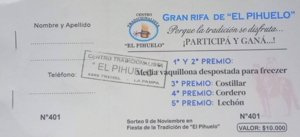 El valor de la rifa es de $10.000 y puede adquirirse a través de los integrantes del Centro Tradicionalista El Pihuelo.